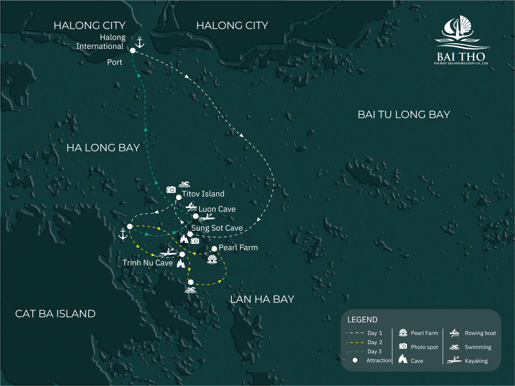 Embark on an unforgettable journey to Halong Bay with our 3 day 2 night cruise, immersing yourself in the breathtaking beauty of both Halong Bay and Lan Ha Bay. Experience kayaking, explore Sung Sot cave, bamboo boat riding in Luon cave, and Bright cave, exploring the pristine beach on Titop island, Trinh Nu cave, getting to know Pearl Farm. Our ancient junks, blending traditional Vietnamese design with modern amenities, ensure your comfort throughout the voyage. Let our personalized service and attention to detail introduce you to the authentic charm of Vietnam, creating memories that will last a lifetime. Discover the stunning beauty of Halong Bay with Bai Tho Junks